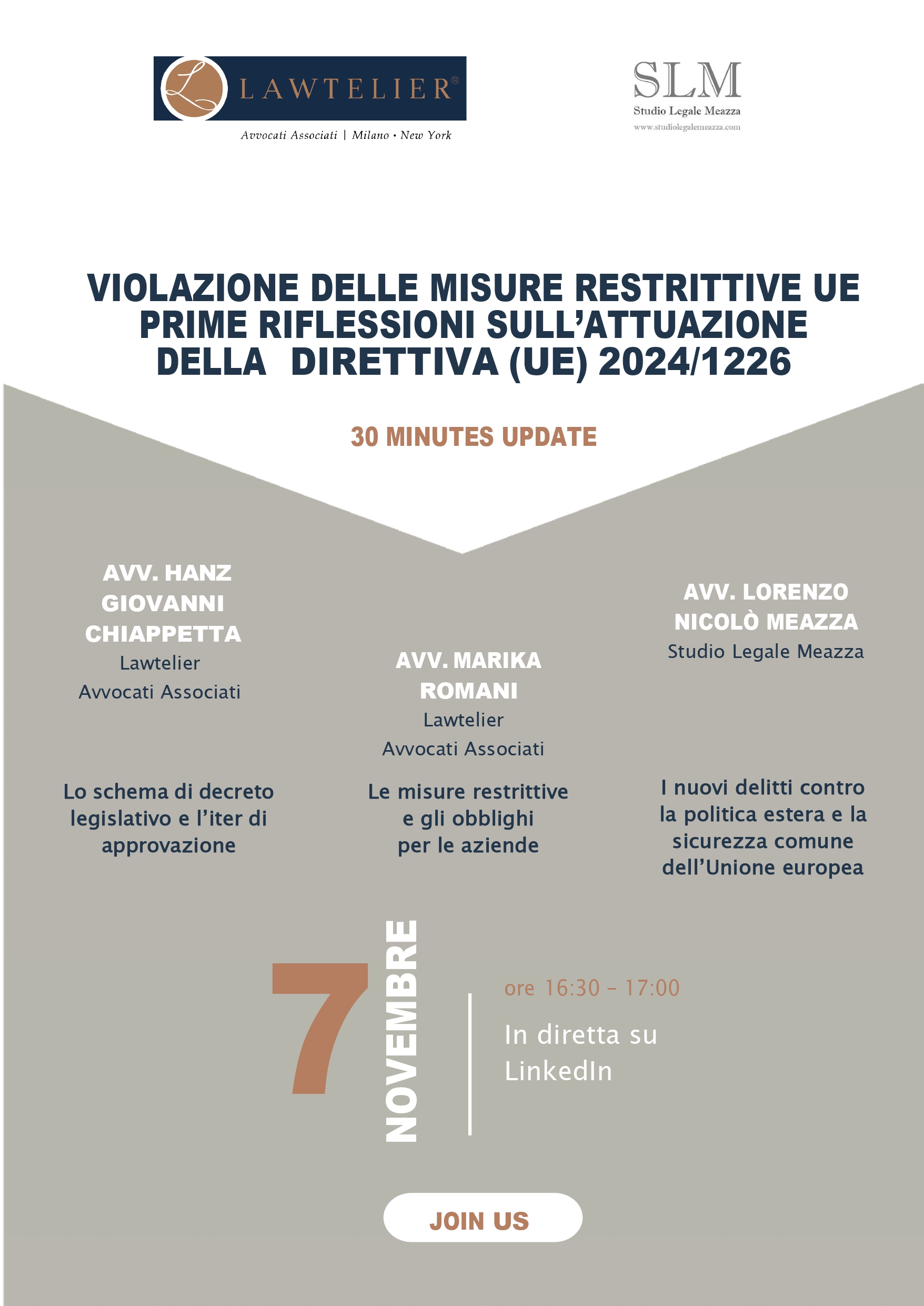 Lawtelier Avvocati Associati e lo Studio Legale Meazza sono lieti di invitarvi a un primo aggiornamento sulle prossime novità normative in tema di misure restrittive imposte dall’Unione Europea con la Direttiva (UE) 2024/1226.